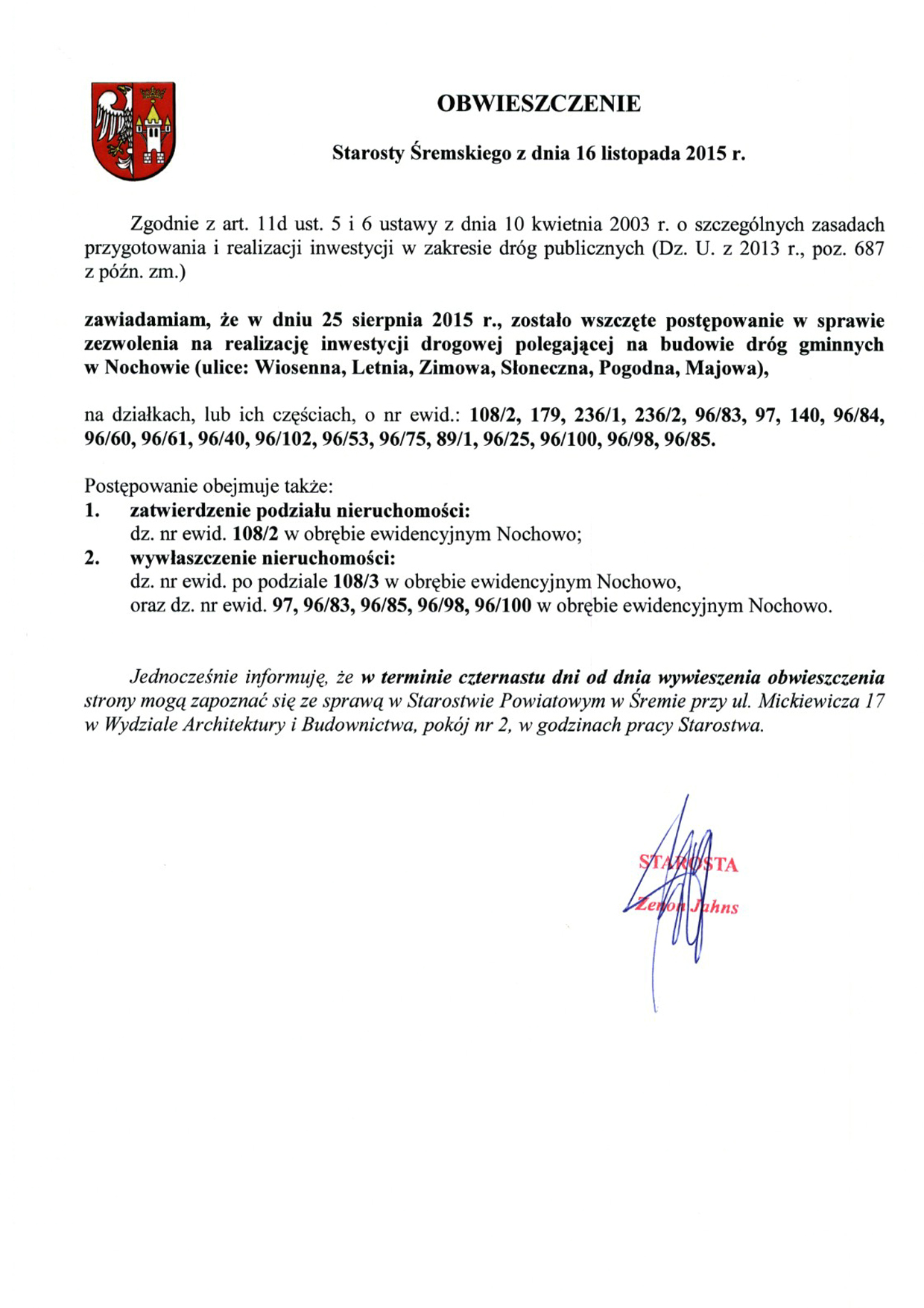 Obwieszczenie Starosty Śremskiego w sprawie inwestycji drogowej w Nochowie budowy dróg gminnych (ul. Wiosenna, Letnia, Zimowa, Słoneczna, Pogodna, Majowa)